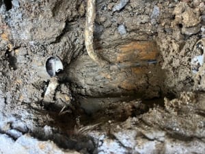 今回は下水の下に潜り込んでいたHIから漏水していました。かなりの長さを加熱させて変形させています。絶対だめだとは言えませんが、体感的にトラブルが多いように思えます。特に困るのが切断した場所が変形していた場合、接手を繋げないということです。こういう場合は結局トーチやヒートガンで接手を同じように変形させて使うか、きれいに全て取り除いてやり直すかということになるわけですが、いずれにせよ変形した箇所は厚みが薄くなったりするので、出来るだけ過熱による加工は避けたいですね。