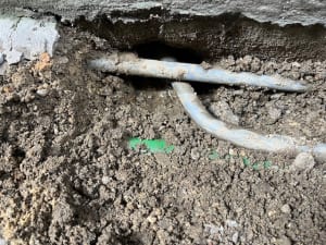 やはり熱で炙るのは良くないといいたいのですが、今回の水漏れの原因は基礎と土砂に圧迫された部分が擦れて漏水したようです。漏水している部分の周囲のコンクリートをギリギリのところを斫らなくてはいけないのですが、ここは腕の見せ所でなんとかなりました。とは言っても一か八かのような仕事はいたしません。万が一、配管が破損した場合はバイパスが取れるよう事前に調査をしております。復旧できなくなったら大変ですからね。
