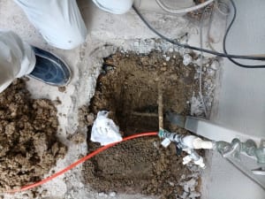 やはり熱で炙るのは良くないといいたいのですが、今回の水漏れの原因は基礎と土砂に圧迫された部分が擦れて漏水したようです。漏水している部分の周囲のコンクリートをギリギリのところを斫らなくてはいけないのですが、ここは腕の見せ所でなんとかなりました。とは言っても一か八かのような仕事はいたしません。万が一、配管が破損した場合はバイパスが取れるよう事前に調査をしております。復旧できなくなったら大変ですからね。