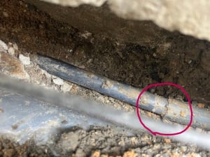 写真を見て頂いての通り、かなり勢いよく漏水しています。地面に埋設されている銅管は当然傷みやすいのですが、全体的に錆びが広がっても意外に穴が開かない限りは漏れなかったりするのです。でも今回は違うようですね。